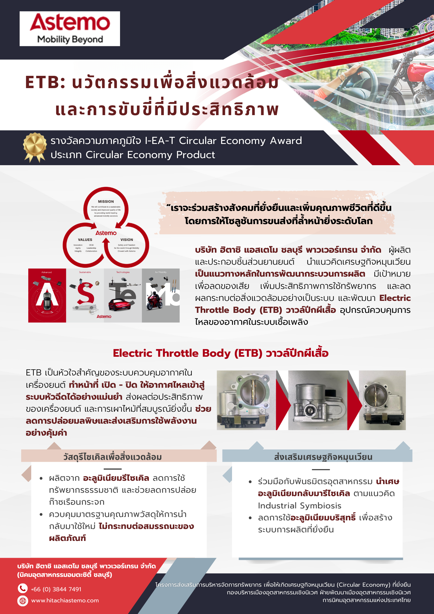 บริษัท ฮิตาชิ แอสเตโม ชลบุรี พาวเวอร์เทรน จำกัด (นิคมอมตะซิตี้ ชลบุรี) ผลิตภัณฑ์ ”Electric Throttle Body (ETB) วาวล์ปีกผีเสื้อ” อุปกรณ์ควบคุมการไหลของอากาศในระบบเชื้อเพลิง