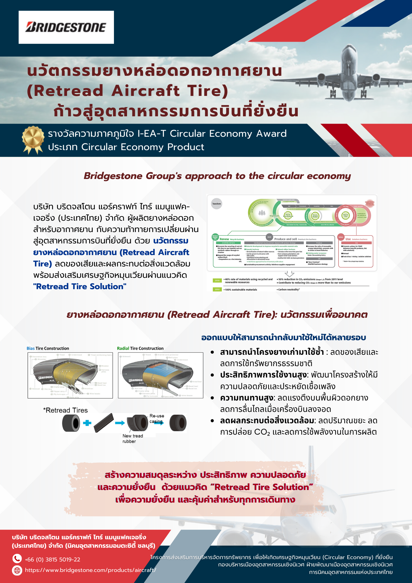 บริษัท บริดจสโตน แอร์คราฟท์ ไทร์ แมนูแฟคเจอริ่ง (ประเทศไทย) จำกัด (นิคมอุตสาหกรรมอมตะซิตี้ ชลบุรี) ผลิตภัณฑ์ ”ยางหล่อดอกอากาศยาน (Retread Aircraft Tire) ออกแบบให้สามารถนำกลับมาใช้ใหม่ได้หลายรอบ