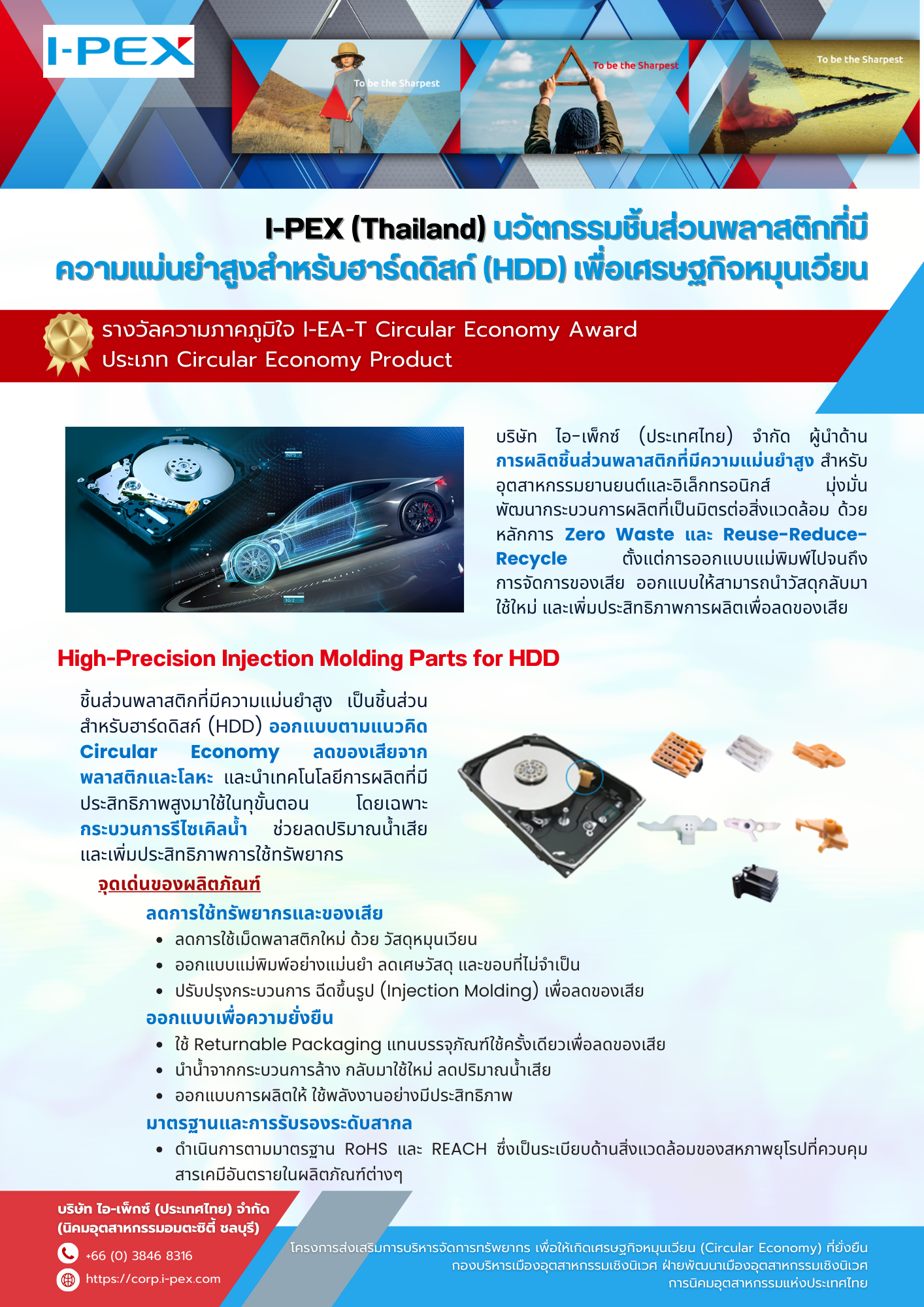 บริษัท ไอ-เพ็กซ์ (ประเทศไทย จำกัด) (นิคมอมตะซิตี้ ชลบุรี) ผลิตภัณฑ์ ”ชิ้นส่วนพลาสติกที่มีความแม่นยำสูงเป็นชิ้นส่วนสำหรับฮาร์ดดิสก์ (HDD)” ออกแบบตามแนวคิด Circular Economy ลดของเสียจากพลาสติกและโลหะ