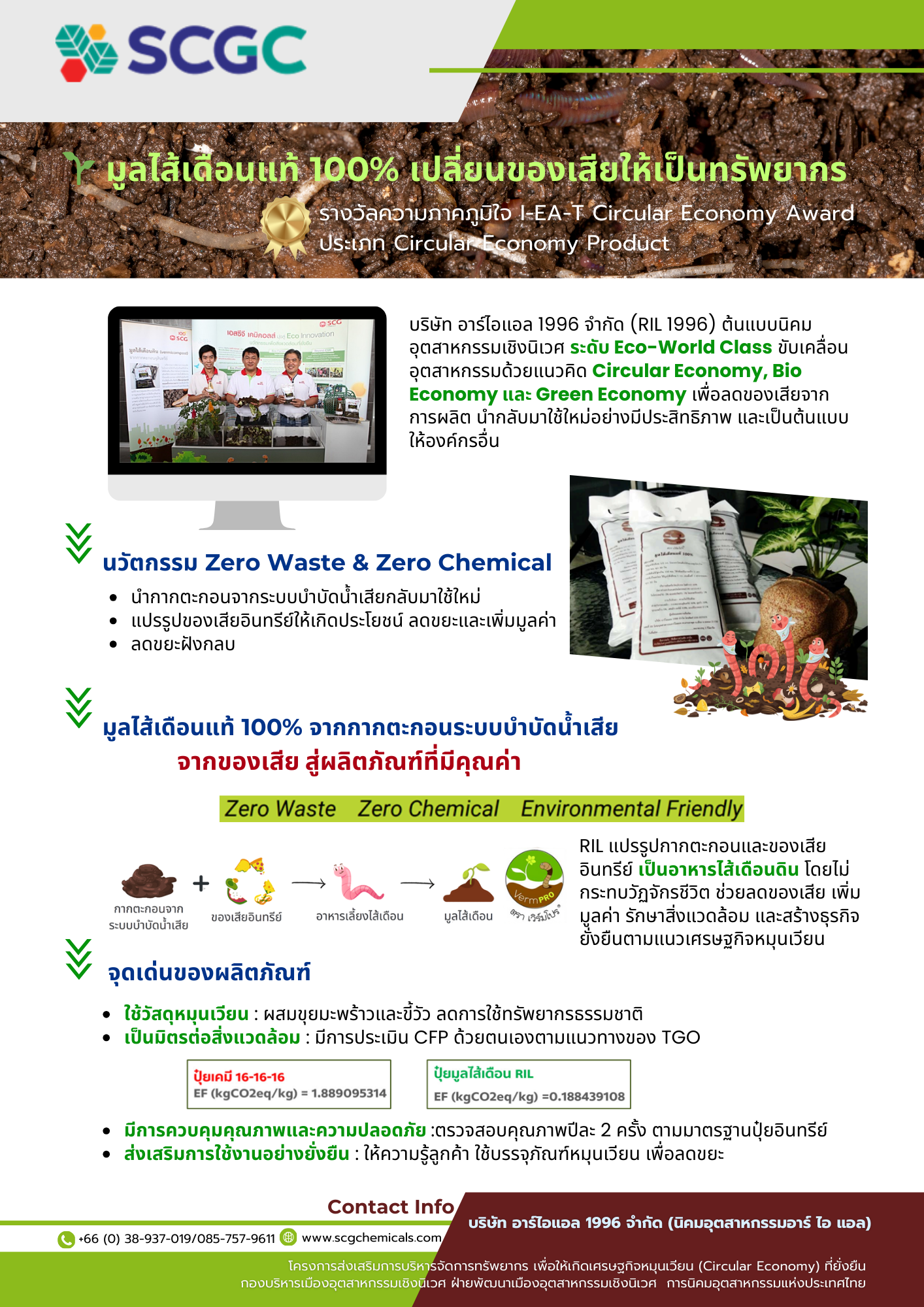 บริษัท อาร์ไอแอล 1996 จำกัด (นิคมอุตสาหกรรมอาร์ ไอ แอล) ผลิตภัณฑ์ ”มูลไส้เดือนแท้ 100%” จากกากตะกอนระบบบำบัดน้ำเสีย