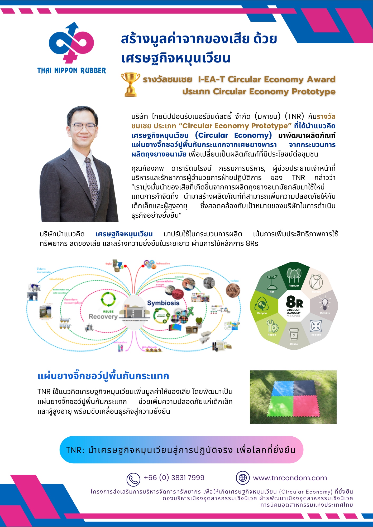 บริษัท ไทยนิปปอนรับเบอร์อินดัสตรี้ จำกัด (มหาชน) (นิคมฯ ปิ่นทอง) ผลิตภัณฑ์ ”แผ่นยางจิ๊กซอว์ปูพื้นกันกระแทก” จากเศษยางพาราที่เหลือจากกระบวนการผลิตถุงยางอนามัย